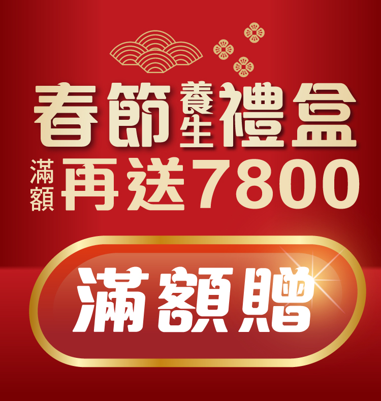 滿19998元送市值2340元指定「無糖葡萄糖胺龜鹿四珍飲60ml*30入」、「無糖元氣雙蔘60ml*30入」,二選一。